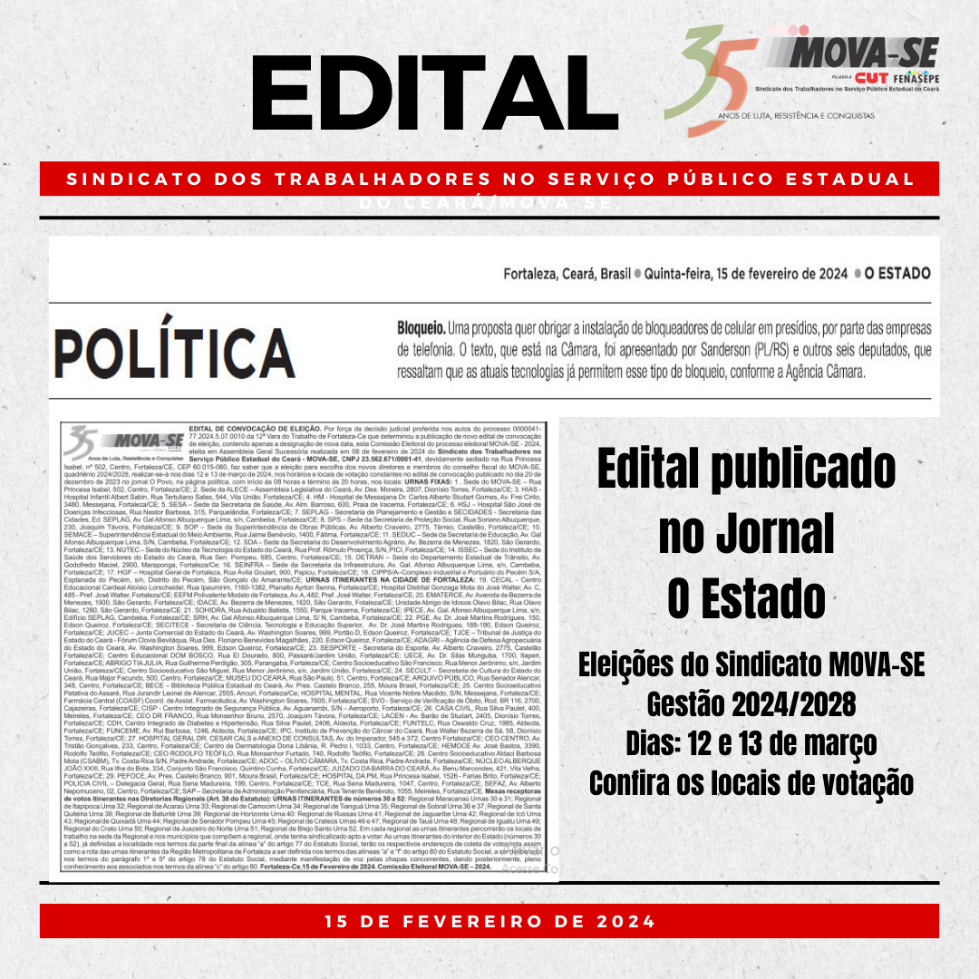 Por força da decisão judicial proferida nos autos do processo 0000041-77.2024.5.07.0010 da 12ª Vara do Trabalho de Fortaleza-Ce que determinou a publicação de novo edital de convocação de eleição, contendo apenas a designação de nova data, esta Comissão Eleitoral do processo eleitoral MOVA-SE – 2024, eleita em Assembleia Geral Sucessória realizada em 08 de fevereiro de 2024 do Sindicato dos Trabalhadores no Serviço Público Estadual do Ceará – MOVA-SE,CNPJ 23.562.671/0001-41, devidamente sediado na Rua Princesa Isabel, nº 502, Centro, Fortaleza/CE, CEP 60.015-060, faz saber que a eleição para escolha dos novos diretores e membros do conselho fiscal do MOVA-SE, quadriênio 2024/2028, realizar-se-á nos dias 12e13 de março de 2024, nos horários e locais de votação constantes no edital de convocação publicado no dia20 de dezembro de 2023 no jornal O Povo,na página política, com início às 08 horas e término às 20 horas, nos locais: URNAS FIXAS:1 . Sede do MOVA-SE – Rua Princesa Isabel, 502, Centro, Fortaleza/CE; 2. Sede da ALECE – Assembleia Legislativa do Ceará, Av.Des. Moreira, 2807, DionísioTorres, Fortaleza/CE; 3. HIAS – Hospital Infantil Albert Sabin, Rua Tertuliano Sales, 544, Vila União, Fortaleza/CE; 4. HM – Hospital de Messejana Dr. Carlos Alberto Studart Gomes, Av. Frei Cirilo, 3480, Messejana, Fortaleza/CE; 5. SESA – Sede da Secretaria de Saúde, Av. Alm. Barroso, 600, Praia de Iracema, Fortaleza/CE; 6. HSJ – Hospital São José de Doenças Infecciosas, Rua Nestor Barbosa, 315, Parquelândia, Fortaleza/CE; 7. SEPLAG – Secretaria de Planejamento e Gestão e SECIDADES – Secretaria das Cidades, Ed. SEPLAG, Av. Gal Afonso Albuquerque Lima, s/n, Cambeba, Fortaleza/CE; 8. SPS – Sede da Secretaria de Proteção Social, Rua Soriano Albuquerque, 230, Joaquim Távora, Fortaleza/CE; 9. SOP – Sede da Superintendência de Obras Públicas, Av. Alberto Craveiro, 2775, Térreo, Castelão, Fortaleza/CE; 10. SEMACE – Superintendência Estadual do Meio Ambiente, Rua Jaime Benévolo, 1400, Fátima, Fortaleza/CE; 11. SEDUC – Sede da Secretaria de Educação, Av. Gal Afonso Albuquerque Lima, S/N, Cambeba, Fortaleza/CE; 12. SDA – Sede da Secretaria do Desenvolvimento Agrário, Av. Bezerra de Menezes, 1820, São Gerardo, Fortaleza/CE; 13. NUTEC – Sede do Núcleo de Tecnologia do Estado do Ceará, Rua Prof. Rômulo Proença, S/N, PICI, Fortaleza/CE; 14. ISSEC – Sede do Instituto de Saúde dos Servidores do Estado do Ceará, Rua Sen. Pompeu, 685, Centro, Fortaleza/CE; 15. DETRAN – Sede do Departamento Estadual de Trânsito, Av. Godofredo Maciel, 2900, Maraponga, Fortaleza/Ce; 16. SEINFRA – Sede da Secretaria da Infraestrutura, Av. Gal Afonso Albuquerque Lima s/n, Cambeba, Fortaleza/CE; 17. HGF – Hospital Geral de Fortaleza, Rua Ávila Goulart, 900, Papicu, Fortaleza/CE; 18. CIPPS/A–Complexo Industrial e Portuário do Pecém S/A, Esplanada do Pecém, s/n, Distrito do Pecém, São Gonçalo do Amarante/CE; URNAS ITINERANTES NA CIDADE DE FORTALEZA: 19. CECAL – Centro Educacional Cardeal Aloísio Lorscheider, Rua Ipaumirim, 1160-1382, Planalto Ayrton Senna, Fortaleza/CE; Hospital Distrital Gonzaga Mota do José Walter, Av. C, 485 – Pref. José Walter, Fortaleza/CE; EEFM Polivalente Modelo de Fortaleza, Av. A, 482, Pref. José Walter, Fortaleza/CE; 20. EMATERCE, Av. Avenida de Bezerra de Menezes, 1900, São Gerardo, Fortaleza/CE; IDACE, Av. Bezerra de Menezes, 1820, São Gerardo, Fotaleza/CE; Unidade Abrigo de Idosos Olavo Bilac, Rua Olavo Bilac, 1280, São Gerardo, Fortaleza/CE; 21. SOHIDRA, Rua Adualdo Batista, 1550, Parque Iracema, Fortaleza/CE; IPECE, Av. Gal.Afonso Albuquerque Lima, s/n, Edifício SEPLAG, Cambeba, Fortaleza/CE; SRH, Av. Gal Afonso Albuquerque Lima, S/ N, Cambeba, Fortaleza/CE; 22. PGE, Av. Dr. José Martins Rodrigues, 150, Edson Queiroz, Fortaleza/CE; SECITECE – Secretaria de Ciência, Tecnologia e Educação Superior Av. Dr. José Martins Rodrigues, 188-190, Edson Queiroz, Fortaleza/CE; JUCEC – Junta Comercial do Estado do Ceará, Av. Washington Soares, 999, Portão D, Edson Queiroz, Fortaleza/CE; TJCE – Tribunal de Justiça do Estado do Ceará – Fórum Clovis Beviláqua, Rua Des. Floriano Benevides Magalhães, 220, Edson Queiroz, Fortaleza/CE; ADAGRI – Agência de Defesa Agropecuária do Estado do Ceará, Av. Washington Soares, 999, Edson Queiroz, Fortaleza/CE; 23. SESPORTE – Secretaria do Esporte, Av. Alberto Craveiro, 2775, Castelão Fortaleza/CE; Centro Educacional DOM BOSCO, Rua El Dourado, 800, Passaré/Jardim União, Fortaleza/CE; UECE, Av. Dr. Silas Munguba, 1700, Itaperi, Fortaleza/CE; ABRIGO TIA JULIA Rua Guilherme Perdigão, 305, Parangaba, Fortaleza/CE; Centro Socioeducativo São Francisco, Rua Menor Jerônimo, s/n, Jardim União, Fortaleza/CE; Centro Socioeducativo São Miguel, Rua Menor Jerônimo, s/n, Jardim União, Fortaleza/CE; 24. SECULT – Secretaria de Cultura do Estado do Ceará, Rua Major Facundo, 500, Centro, Fortaleza/CE; MUSEU DO CEARÁ, Rua São Paulo, 51, Centro, Fortaleza/CE; ARQUIVO PÚBLICO, Rua Senador Alencar, 348, Centro, Fortaleza/CE; BECE – Biblioteca Pública Estadual do Ceará, Av. Pres. Castelo Branco, 255, Moura Brasil, Fortaleza/CE; 25.Centro Socioeducativo Patativa do Assaré, Rua Jurandir Leonel de Alencar, 2555, Ancuri, Fortaleza/Ce; HOSPITALMENTAL, Rua Vicente Nobre Macêdo, S/n, Messejana, Fortaleza/CE; Farmácia Central (COASF) Coord. de Assist.Farmacêutica, Av. Washington Soares, 7605, Fortaleza/CE; SVO – Serviço de Verificação de Óbito, Rod. BR 116, 2700, Cajazeiras, Fortaleza/CE; CISP – Centro Integrado de Segurança Pública, Av. Aguanambi, S/N – Aeroporto, Fortaleza/CE; 26. CASA CIVIL, Rua Silva Paulet, 400, Meireles, Fortaleza/CE; CEODR FRANCO, Rua Monsenhor Bruno, 2570, Joaquim Távora, Fortaleza/CE; LACEN – Av. Barão de Studart, 2405, Dionísio Torres, Fortaleza/CE; CDH, Centro Integrado de Diabetes e Hipertensão, Rua Silva Paule