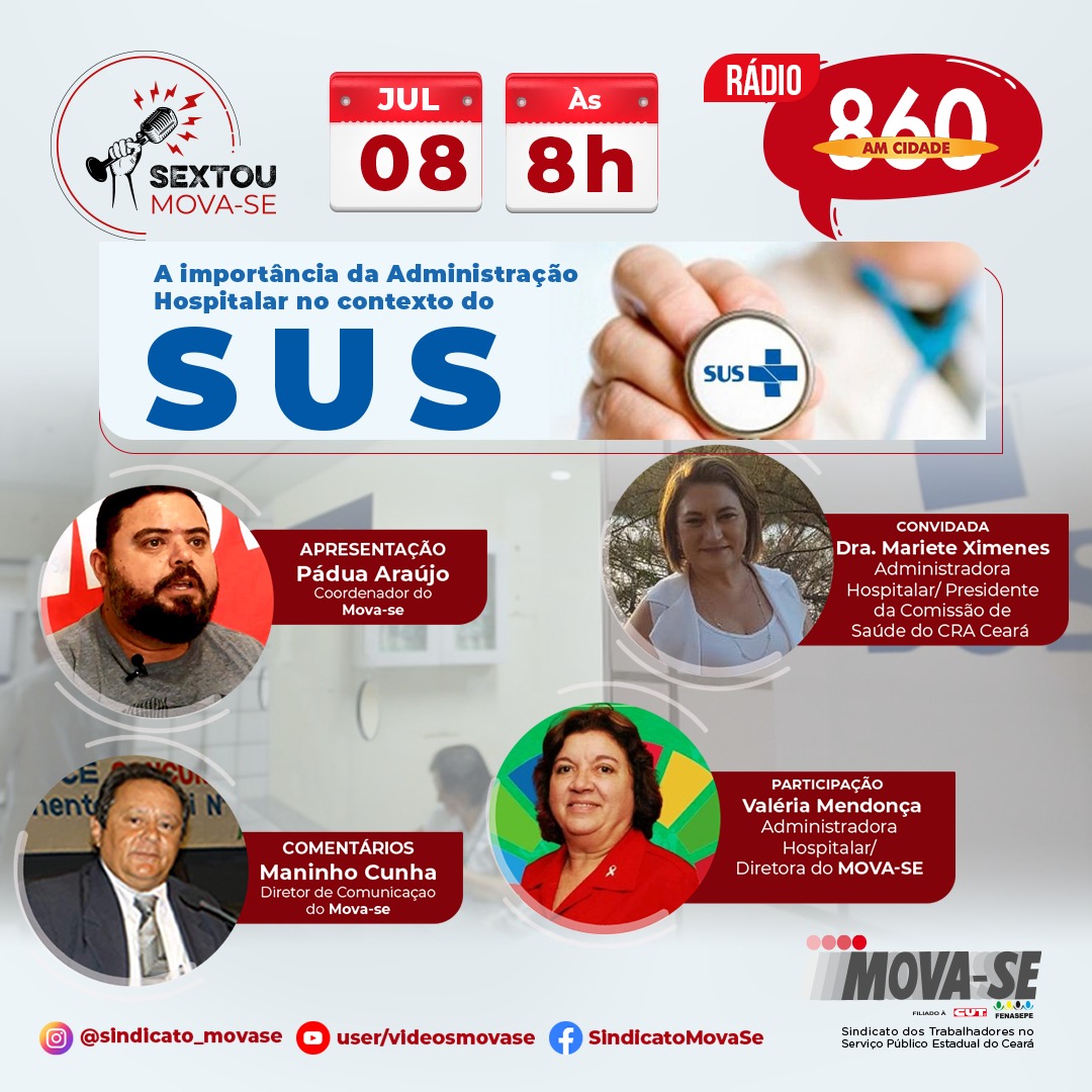A importância da Administração Hospitalar no contexto do SUS é tema do nosso programa de amanhã, 15/07, às 8h. Acompanhe o SEXTOU MOVA-SE ao vivo pela Rádio Cidade AM 860, ou na ou na plataforma digital: