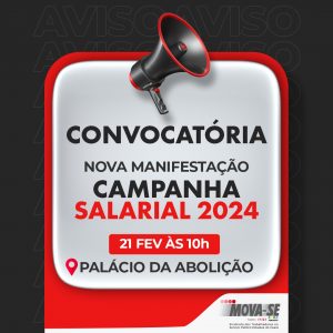 O Fórum Unificado das Associações e Sindicatos dos Servidores Públicos Estaduais (Fuaspec) convoca nova manifestação dos servidores públicos para a próxima quarta-feira, 21 de fevereiro, às 10h, no Palácio da Abolição. Na ocasião, a coordenação do Fórum será recebida pelo secretário da Articulação Política do governo Elmano, Waldemir Catanho, com a expectativa de uma resposta concreta sobre a pauta da Campanha Salarial 2024.