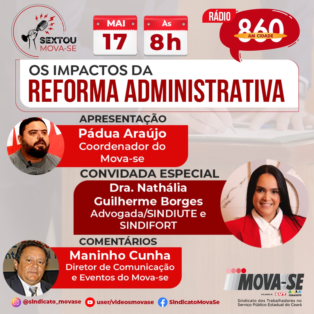 Confira no programa de Rádio Sextou Mova-se, que estará ao vivo nesta sexta-feira, dia 17/05, de 8h às 8h55min neste dia, vamos conversar sobre Os impactos da Reforma Administrativa.