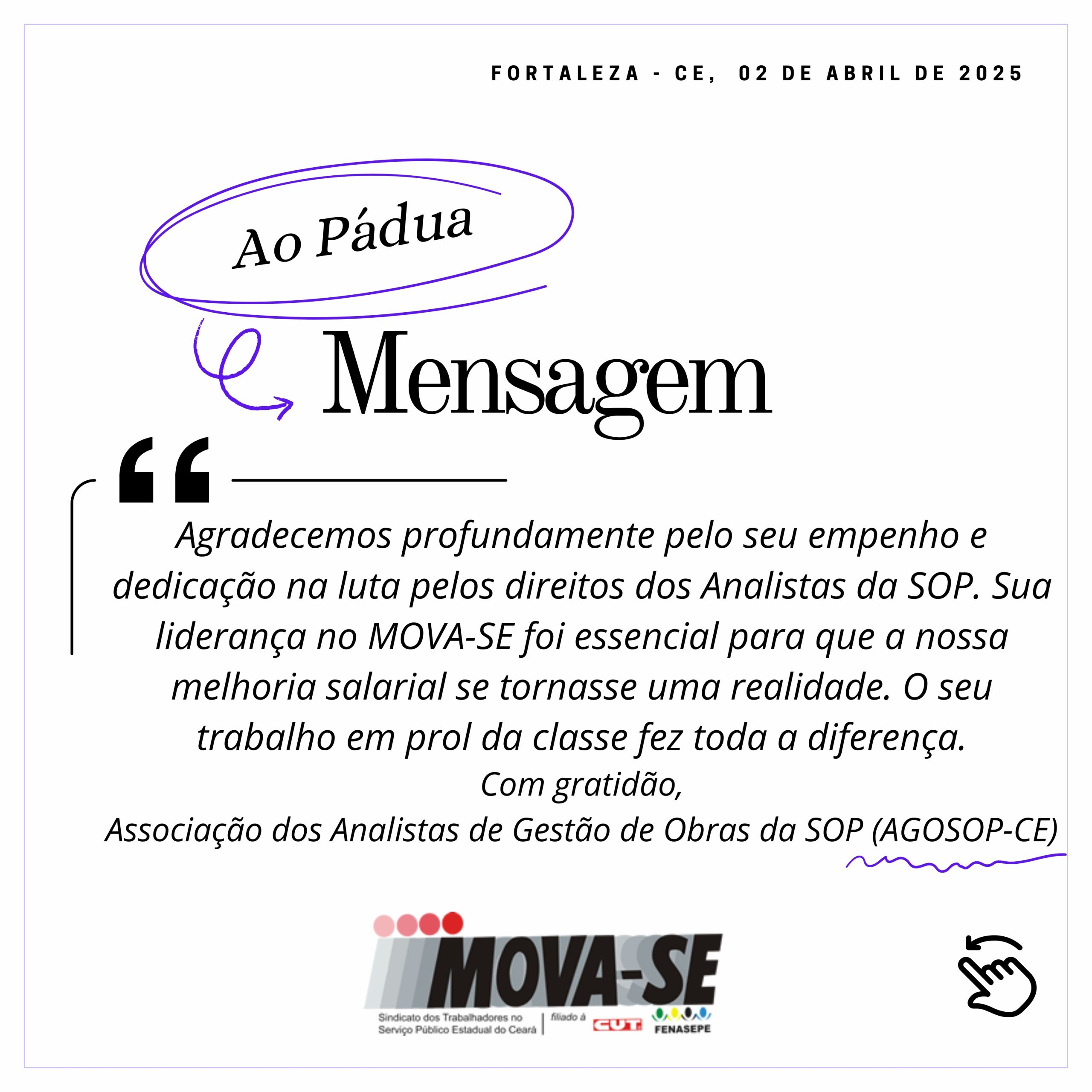Agradecemos profundamente pelo seu empenho e dedicação na luta pelos direitos dos Analistas da SOP. Sua liderança no MOVA-SE foi essencial para que a nossa melhoria salarial se tornasse uma realidade. O seu trabalho em prol da classe fez toda a diferença.
