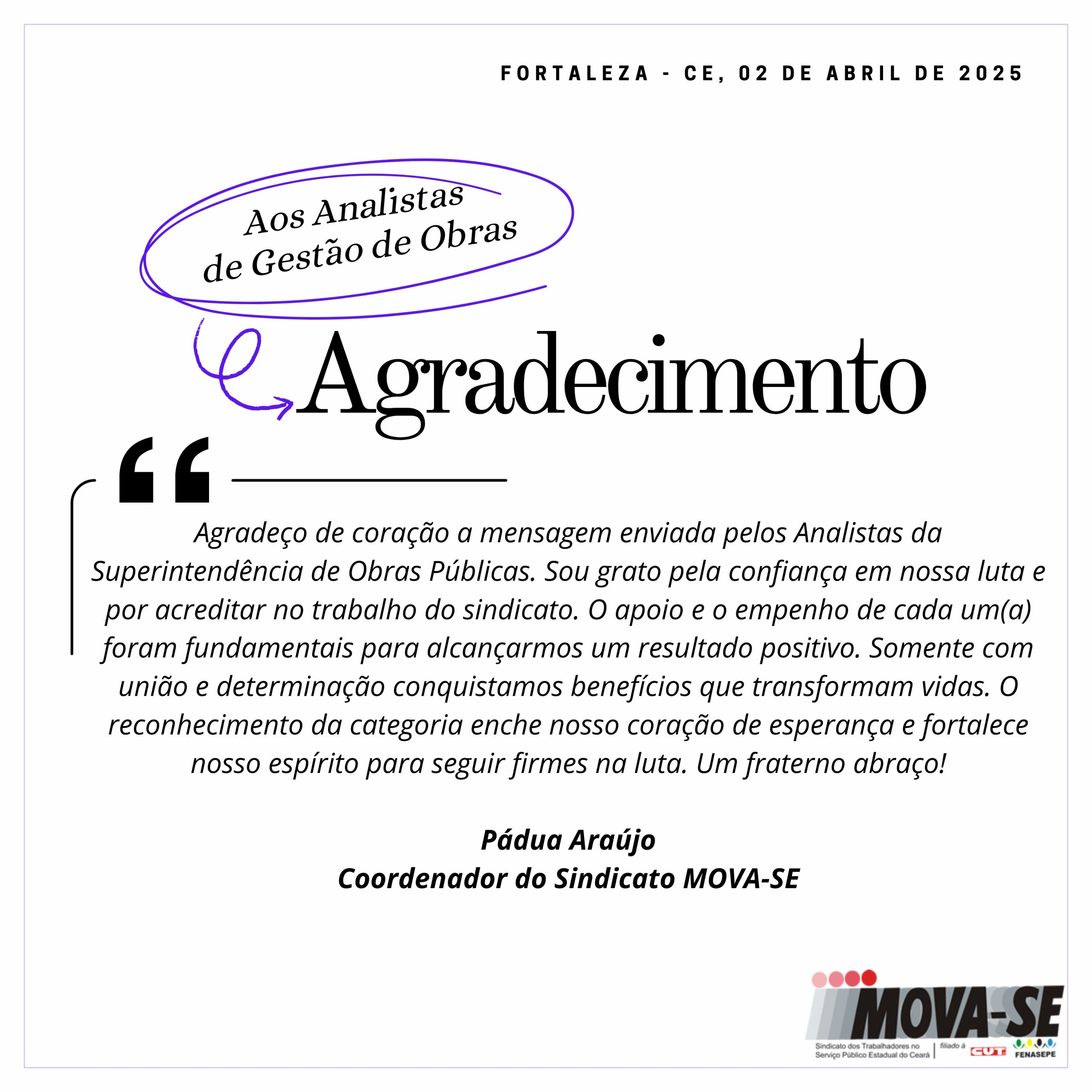 “Agradeço de coração a mensagem enviada pelos Analistas da Superintendência de Obras Públicas. Sou grato pela confiança em nossa luta e por acreditar no trabalho do sindicato. O apoio e o empenho de cada um(a) foram fundamentais para alcançarmos um resultado positivo. Somente com união e determinação conquistamos benefícios que transformam vidas. O reconhecimento da categoria enche nosso coração de esperança e fortalece nosso espírito para seguir firmes na luta. Um fraterno abraço!”