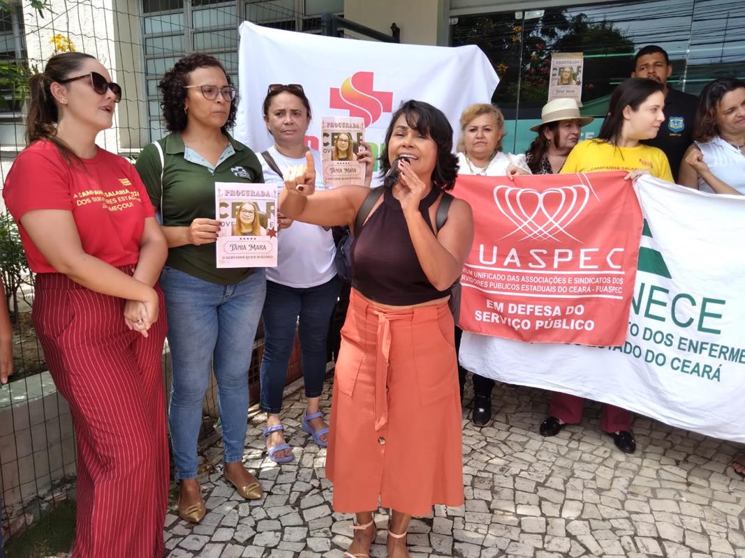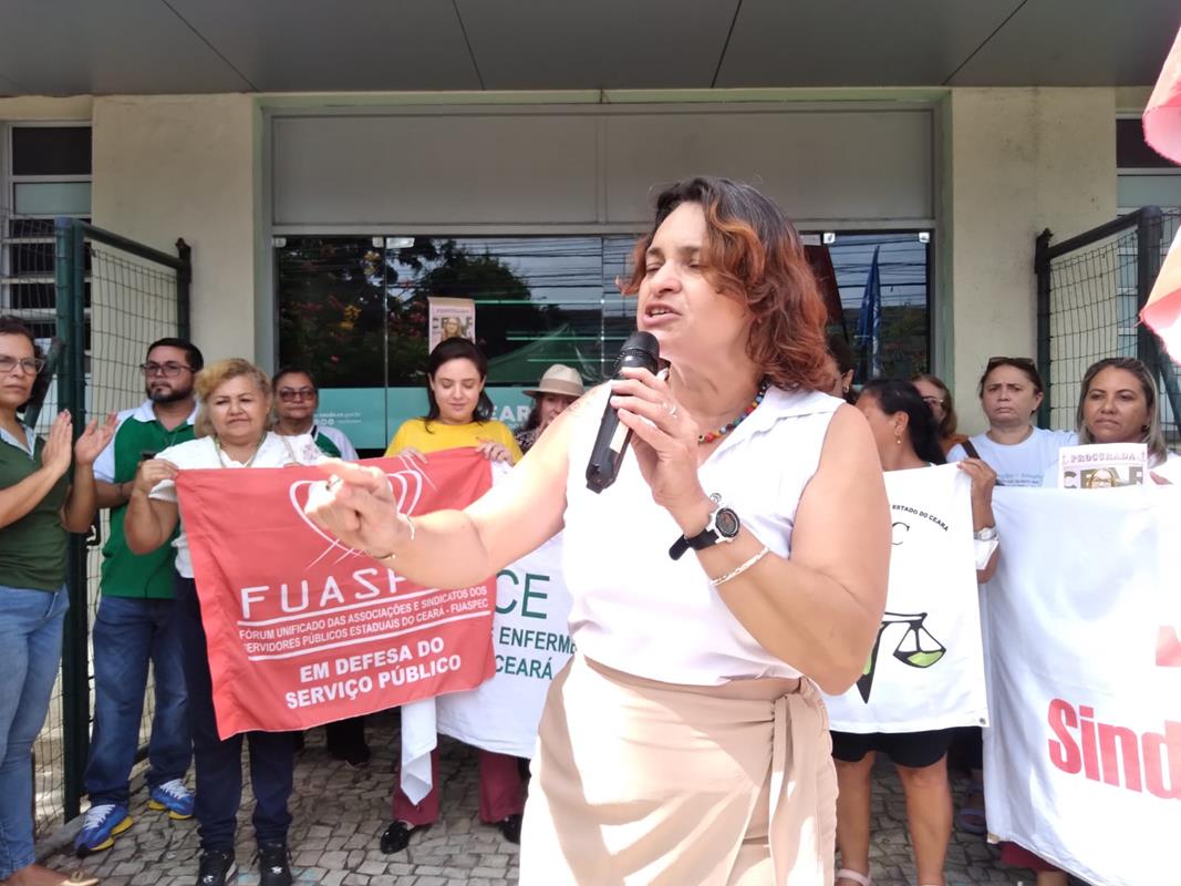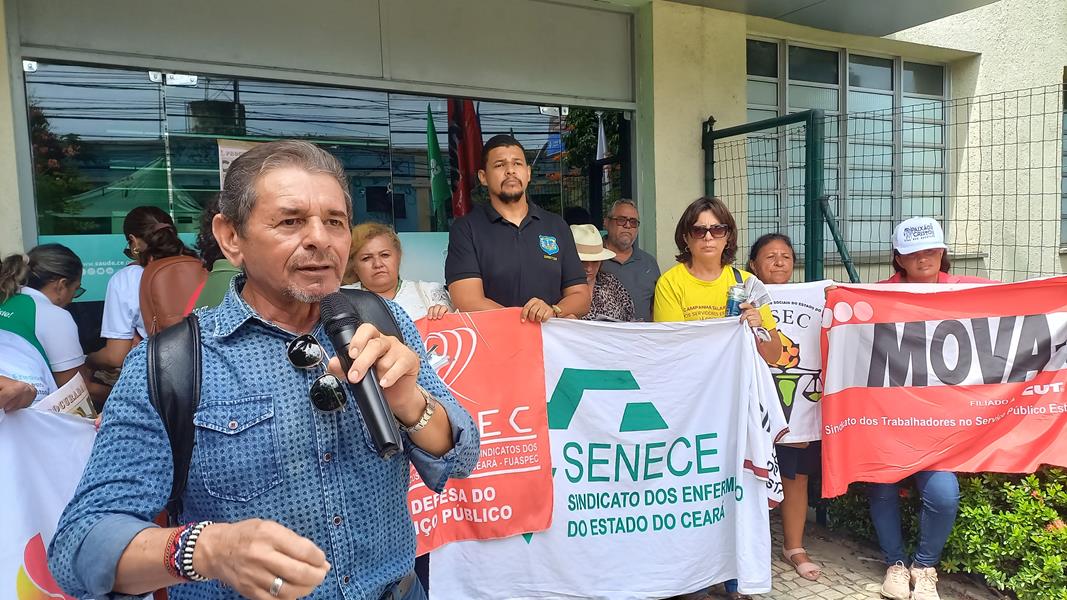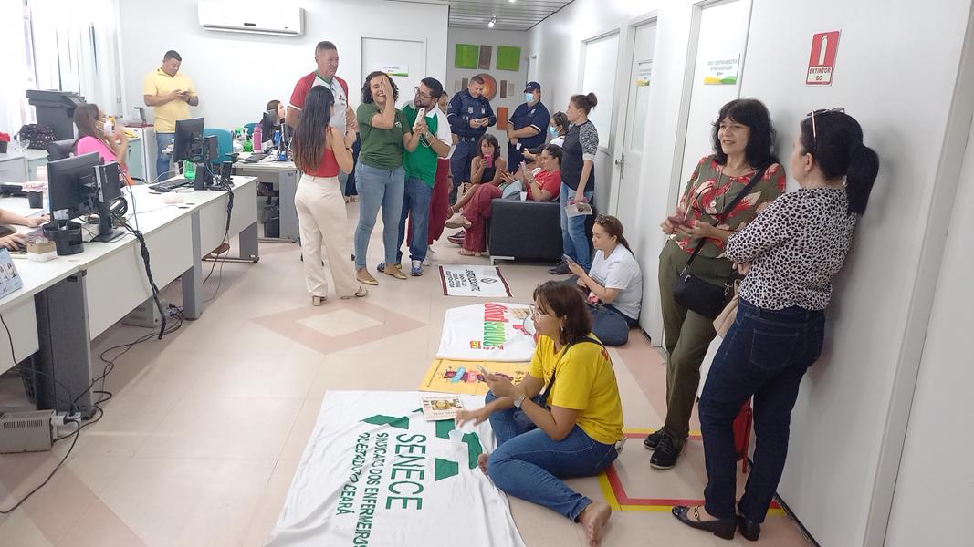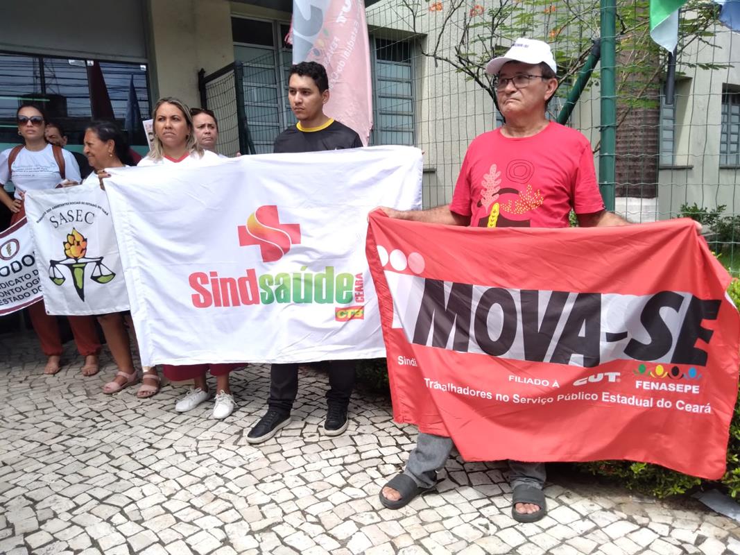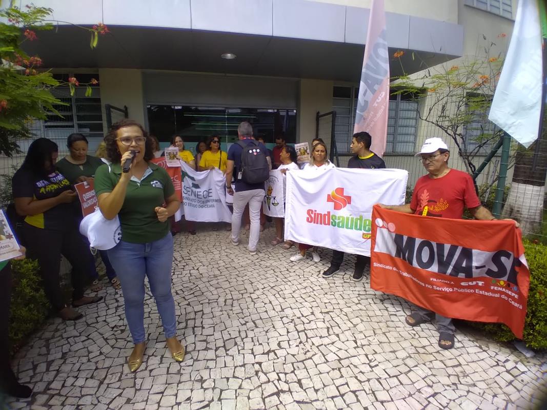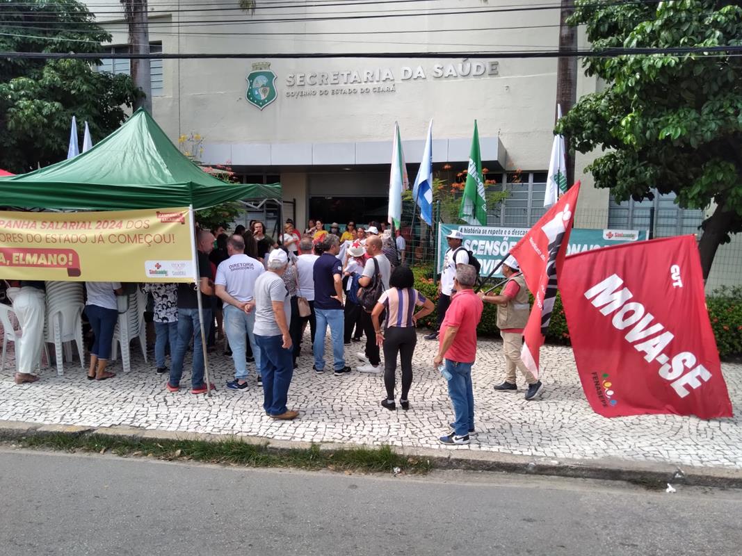 Os servidores públicos ocuparam a Secretaria da Saúde do Estado (SESA), nesta terça-feira, 02 de abril, para protestar contra o reajuste de 5,62% concedido pelo Governo do Ceará, e repudiar o desrespeito do governo referente aos retroativos, a manifestação também foi para exigir o diálogo com a secretária da Saúde do Ceará, Tânia Mara Coelho.