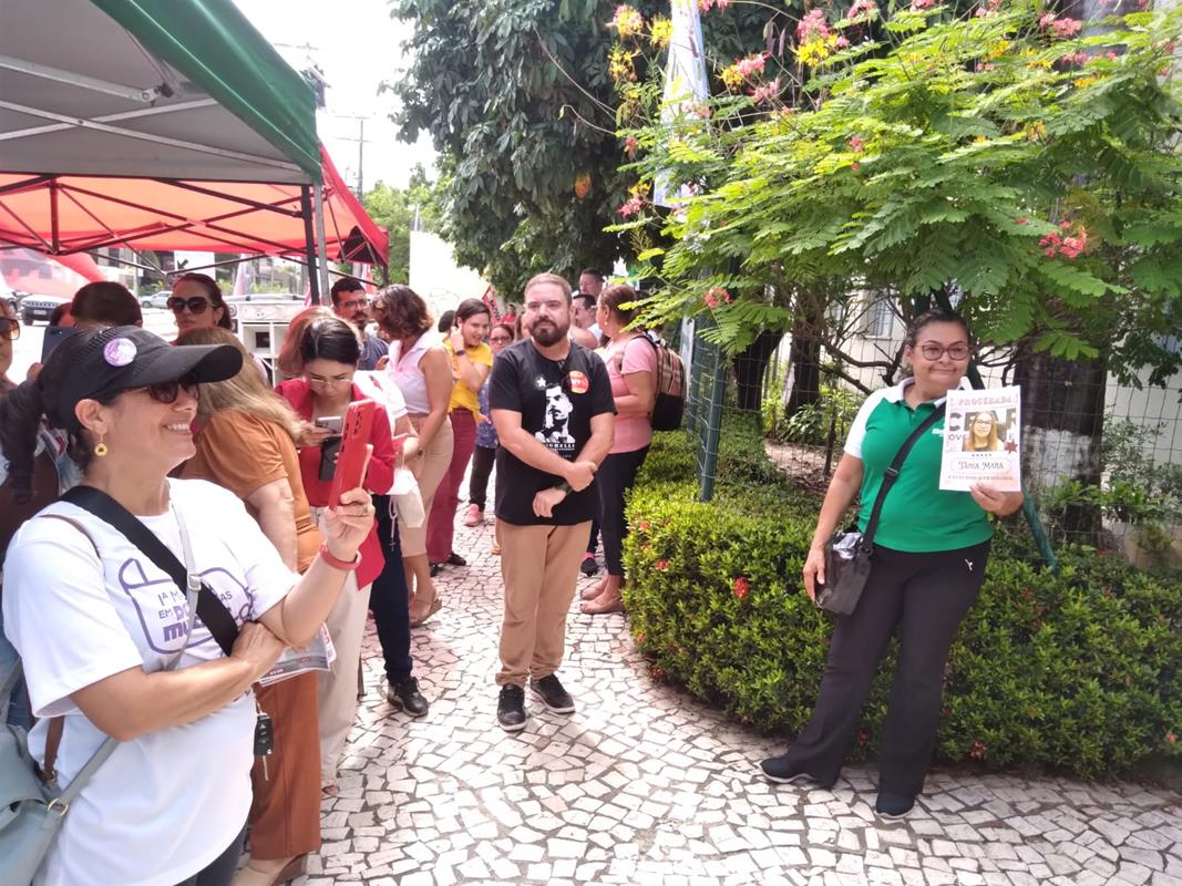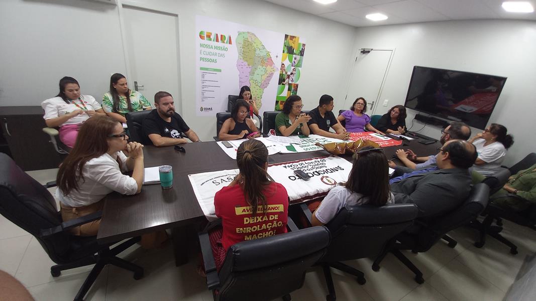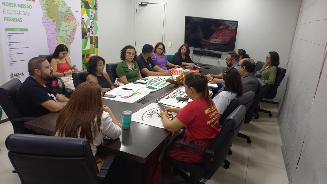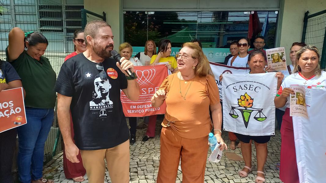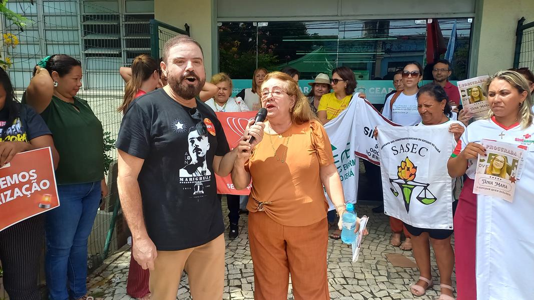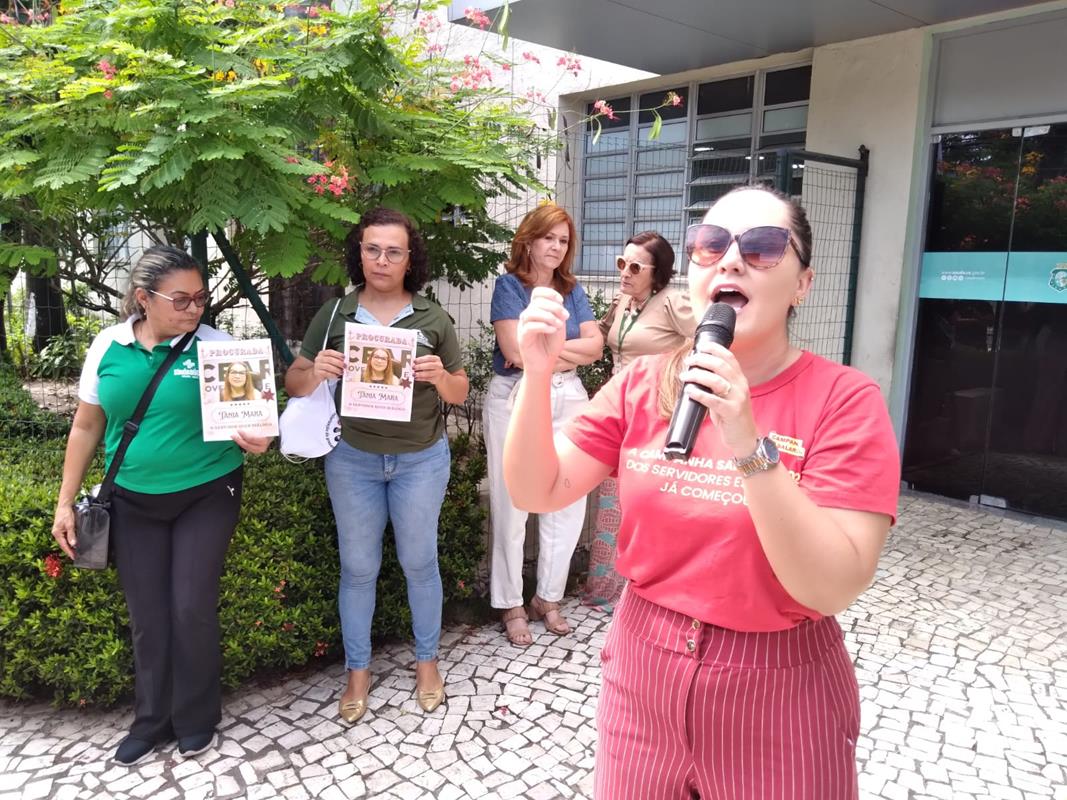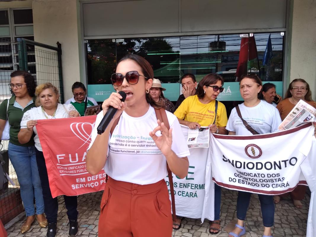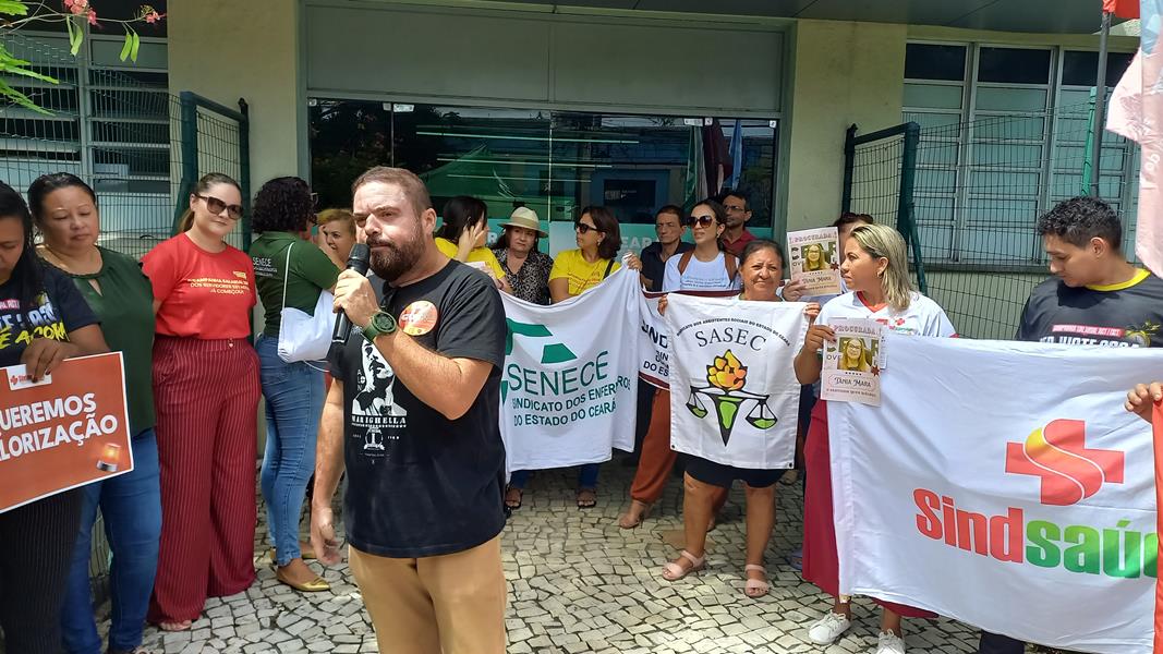Os servidores públicos ocuparam a Secretaria da Saúde do Estado (SESA), nesta terça-feira, 02 de abril, para protestar contra o reajuste de 5,62% concedido pelo Governo do Ceará, e repudiar o desrespeito do governo referente aos retroativos, a manifestação também foi para exigir o diálogo com a secretária da Saúde do Ceará, Tânia Mara Coelho.