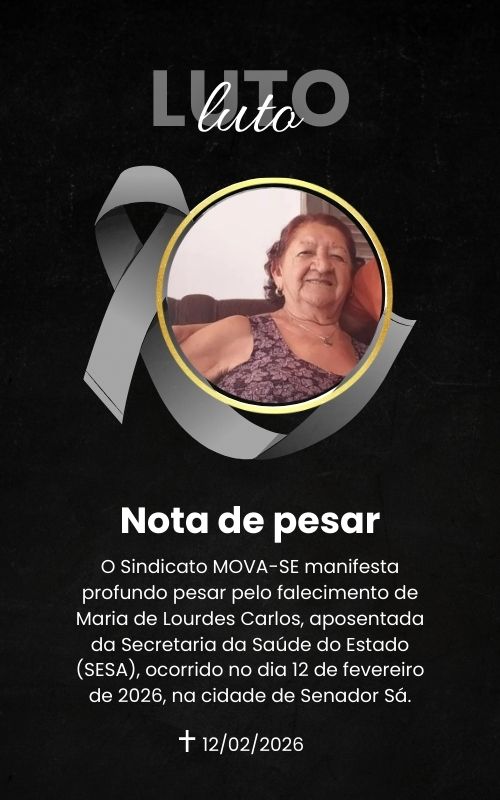 O Sindicato MOVA-SE manifesta profundo pesar pelo falecimento de Maria de Lourdes Carlos, aposentada da Secretaria da Saúde do Estado (SESA), ocorrido no dia 12 de fevereiro de 2026, na cidade de Senador Sá.