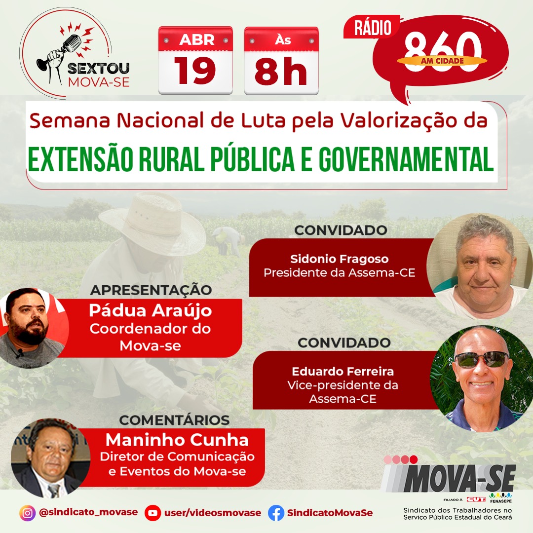 Confira no programa de Rádio Sextou Mova-se, que estará ao vivo nesta sexta-feira, dia 19/04, de 8h às 8h55min neste dia, vamos conversar sobre Semana Nacional de Luta Pela Valorização da Extensão Rural Pública e Governamental.